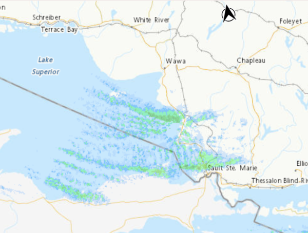 Weather radar show snow squalls hitting the region. MTO mapping showing ‘Track my Plow’ doesn’t display any snow plows working between Mobert and SSM. Wawa-news did observe a snow plow headed east from Wawa just after 7 a.m.