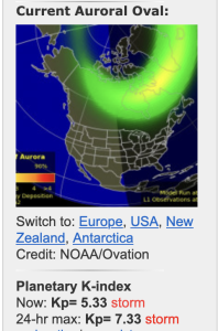 During the day, Sunday, predictions were made that this solar storm would continue with more northern lights forecast for Sunday night. Sure enough, as soon as it was dark enough to see the Dipper, Orion’s shoulders peeking above the horizion – and a band of northern lights stretching betwixt them.
