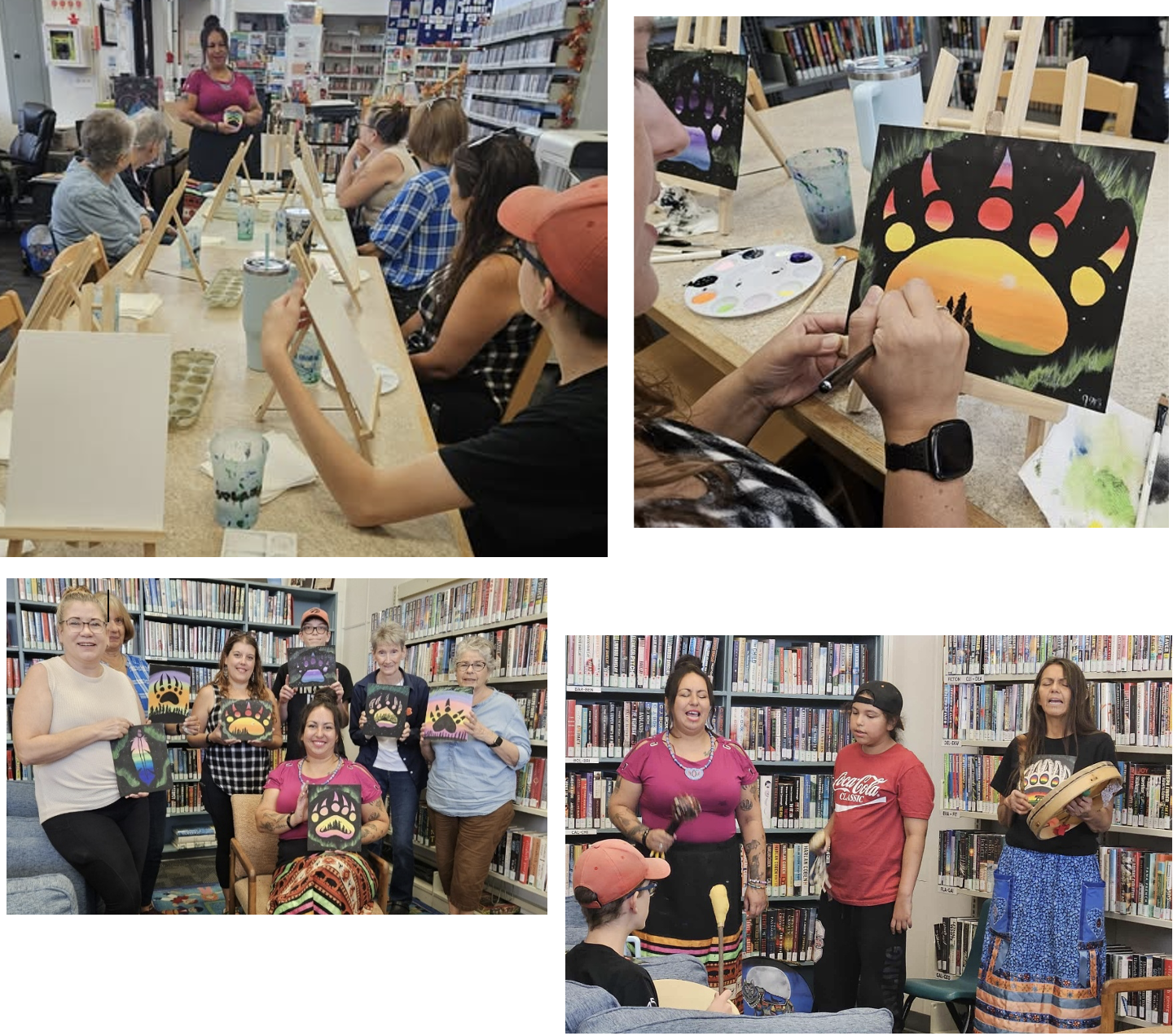 Paint Day with Christina@Shkode Ma’iingan! What a great way to celebrate the start of First Nations Public Library Week! A huge thank you to Christina for sharing her amazing artistic talent and her beautiful teachings with us. We learned a lot about Makwa and the Eagle Feather and how we are bound together with nature. It was a wonderful afternoon learning new painting techniques and gaining confidence and the results were spectacular. To top off the afternoon, the Eagle Medicine Singers gathered to sing and drum. It was beautiful and so moving and uplifting. Feeling the heartbeat of the drum is so comforting! Thank you to Adrienne, Waseya and Christina for sharing with us! Chi Miigwech.