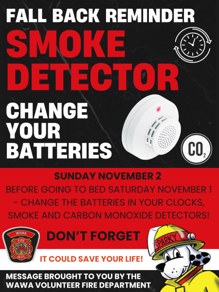 Clocks will fall back one hour at 2 a.m. on November 2nd and the Wawa Fire Department is recommending residents install new batteries in their smoke and carbon monoxide alarms when they change their clocks.