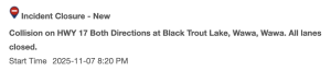 A collision on Highway 17 just west of Black Trout Lake (8km west of Wawa) has blocked both lanes. The closure began at 20:20.