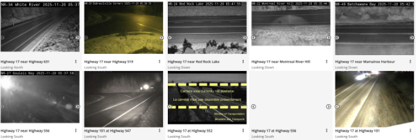 | Hwy 129 | From Thessalon to Hinckler Lake | Bare and dry road | Good | No | 2025-11-20 05:18 | |