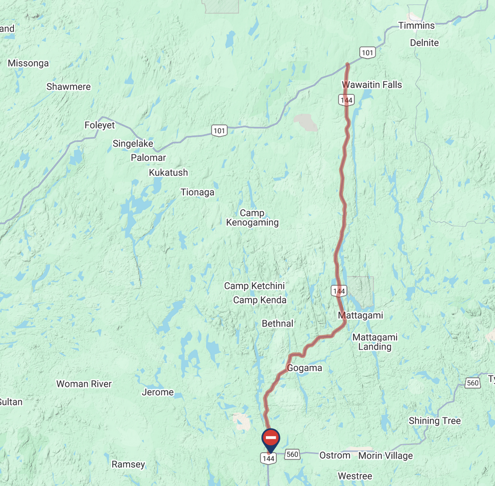 Hwy. 144 all lanes closed from the Watershed (Ramsey Road/Sultan Industrial Road) to the 144/101 Junction south of Timmins, due to emergency road repairs (sinkhole).