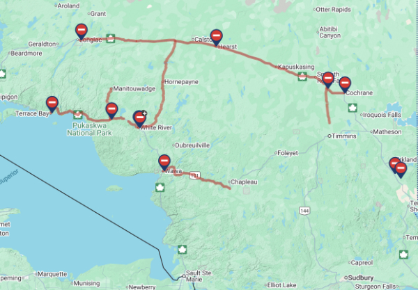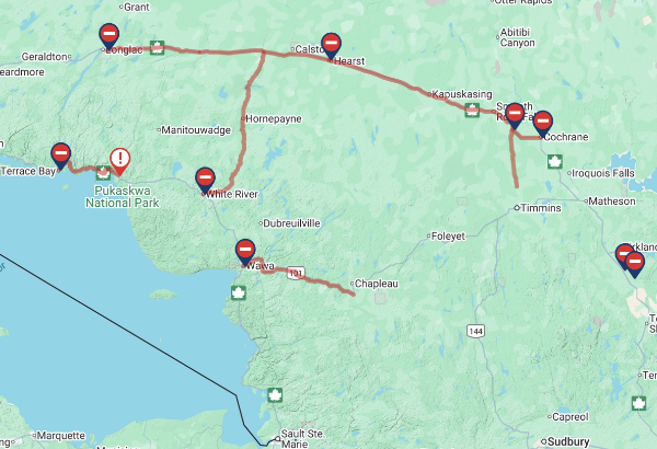 | Closed | 101 | Wawa | to | Chapleau | 2025-11-27 6:21 AM | Weather, tractor trailer in the ditch near Prairie Bee Lake Road (2:15) |