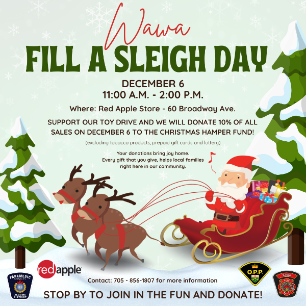 Fill a Sleigh Day! Author Recent Posts Ad TextThis is an advertisement. If you are interested in placing an ad for your business, and take advantage of the 3,000 visitors daily to this site - please email brenda @ wawa-news.com for more information. Latest posts by Ad Text (see all) Fill a Sleigh Day! - December 1, 2025 St. Augustine French Immersion School Bottle Drive – POSTPONED - November 26, 2025 Notice of Study Commencement – Hwy 17/ Hwy 519 Rest Area - October 30, 2025 2025-12-01 Ad Text