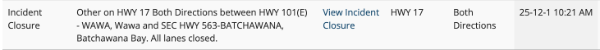 Highway 17 is closed between Wawa (Pinewood Drive) and Batchawana Bay (Junction of 17/563) due to Highway 17 being blocked at the Montreal River Hill.