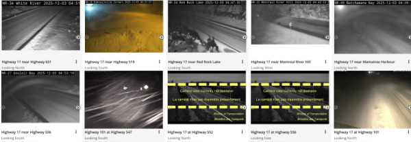 | Hwy 519 | Hwy 17 – Dubreuilville | Snow covered | Poor | No | 2025-12-03 05:24 | |