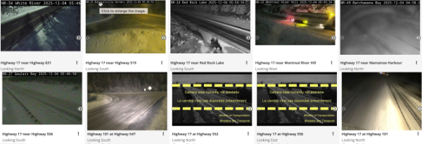 | Hwy 519 | Hwy 17 – Dubreuilville | Bare and wet road | Snow covered | Good | No | 2025-12-04 05:22 |