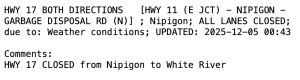 - Hwy 17 (White River to Mobert) CLOSED - December 5, 2025