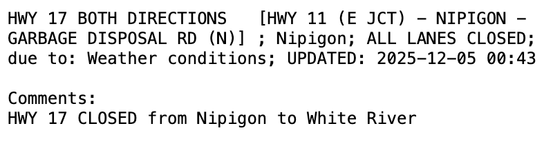 - Hwy 17 (White River to Nipigon) CLOSED - December 5, 2025