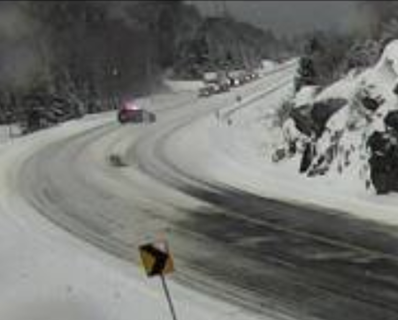 Traffic is now flowing on the Montreal River Hill, OPP are no longer visible on the webcam holding traffic. The highway now looks bare and wet. Please drive with care.