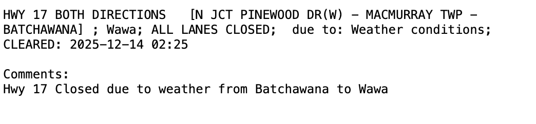 - Hwy 17 (Wawa to Batchawana) OPEN - December 13, 2025