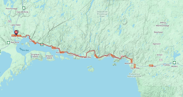 The map above shows the highway closed from White River to Brenmer Flats. Then closed again from Nokomis Road (Netmizaaggamig Nishnaabeg Unsurrendered (Pic Mobert FN)) to Nipigon.