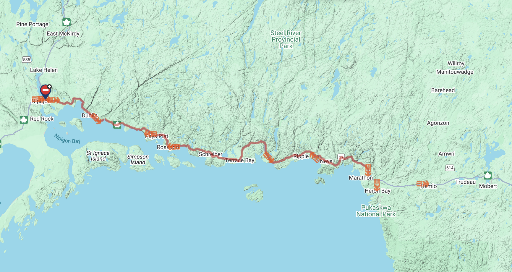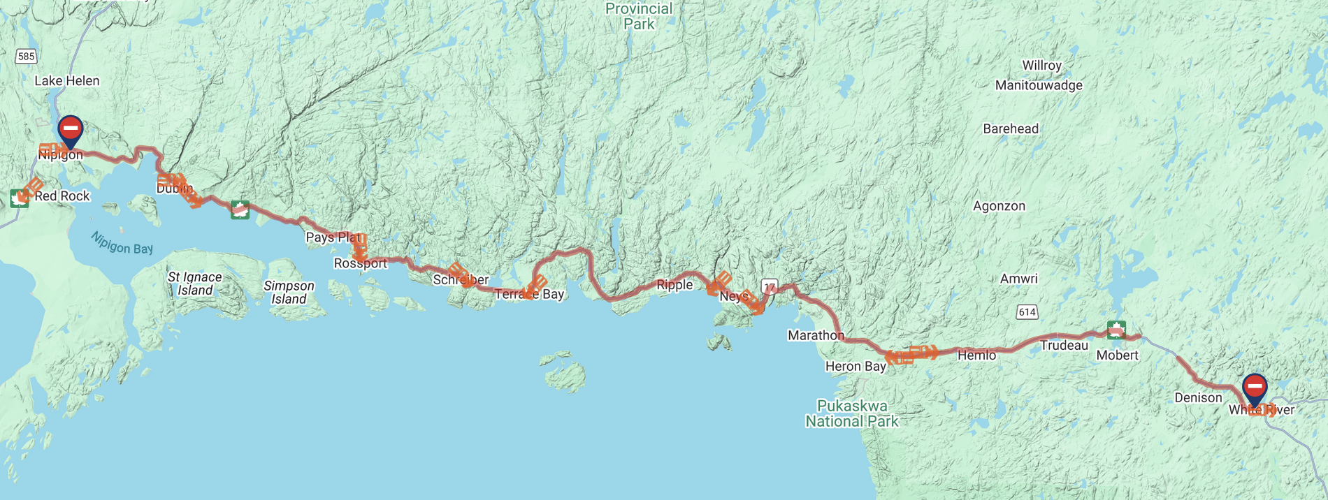 The map above shows the highway closed from White River to Brenmer Flats. Then closed again from Nokomis Road (Netmizaaggamig Nishnaabeg Unsurrendered (Pic Mobert FN)) to Nipigon.