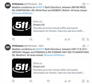 - Hwy 17 (White River to Nipigon) CLOSED - December 18, 2025