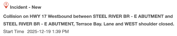 Hwy 17 – Terrace Bay – Steel River the westbound lane is blocked due to a stuck TTU. (email alert)