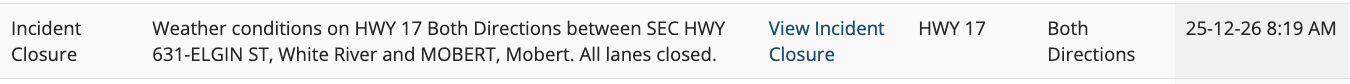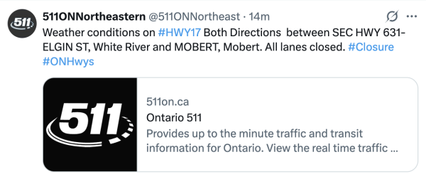 However: An alert email from ON511 at 8:19 states that Hwy 17 is closed from White River to Marathon.