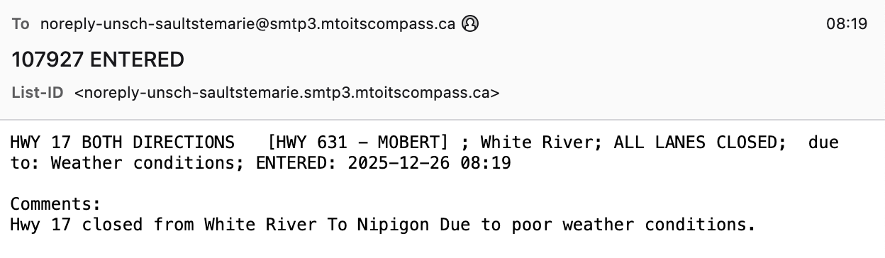- Hwy 17 (White River to Marathon) CLOSED - December 26, 2025