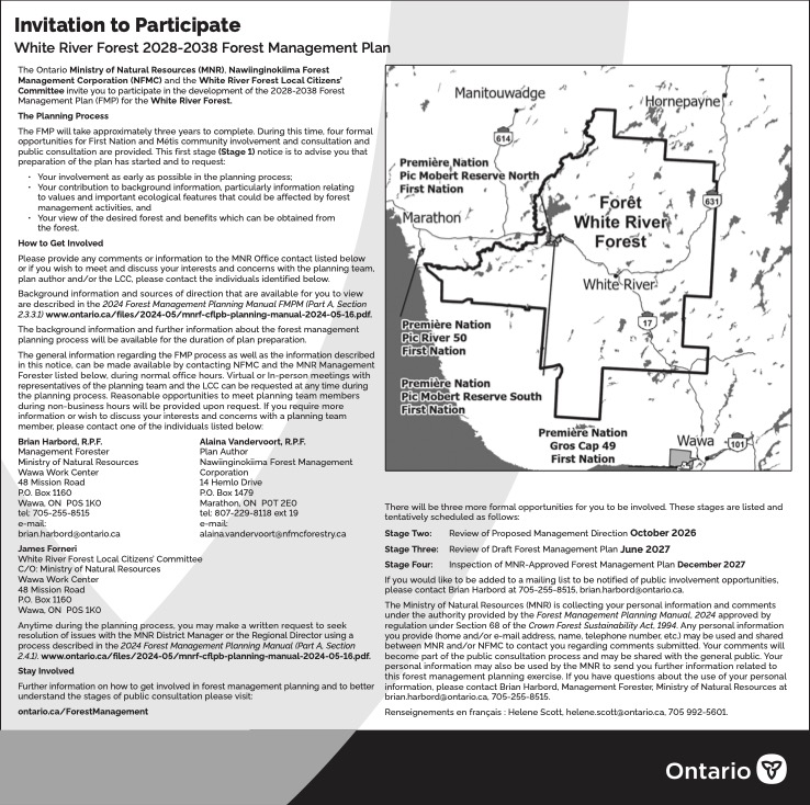 White River Forest – Invitation to Participate Author Recent Posts Ad TextThis is an advertisement. If you are interested in placing an ad for your business, and take advantage of the 3,000 visitors daily to this site - please email brenda @ wawa-news.com for more information. Latest posts by Ad Text (see all) White River Forest -Invitation à participer - February 3, 2026 White River Forest – Invitation to Participate - February 3, 2026 Casual Clerical and Casual Library Technician – Wawa - January 26, 2026 2026-02-03 Ad Text