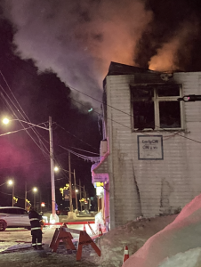 Watching the blaze was terrifying. Although no one was in the buildings (North of 17, AJ’s Pizza and apartment), the buildings were at risk. Firefighters worked hard to keep the fire from spreading to the neighbouring structures – there is some damage to AJ’s building, with the extents unknown.