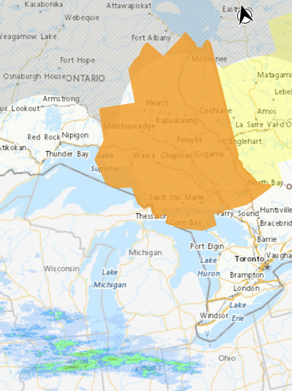Additional information: A hazardous winter storm will begin affecting northeastern Ontario on Sunday. Precipitation will primarily be rapidly accumulating snowfall however there is a chance freezing rain or ice pellets could mix in for southern regions on a line from Sault Ste. Marie to Kirkland Lake, reducing their total snowfall amounts.