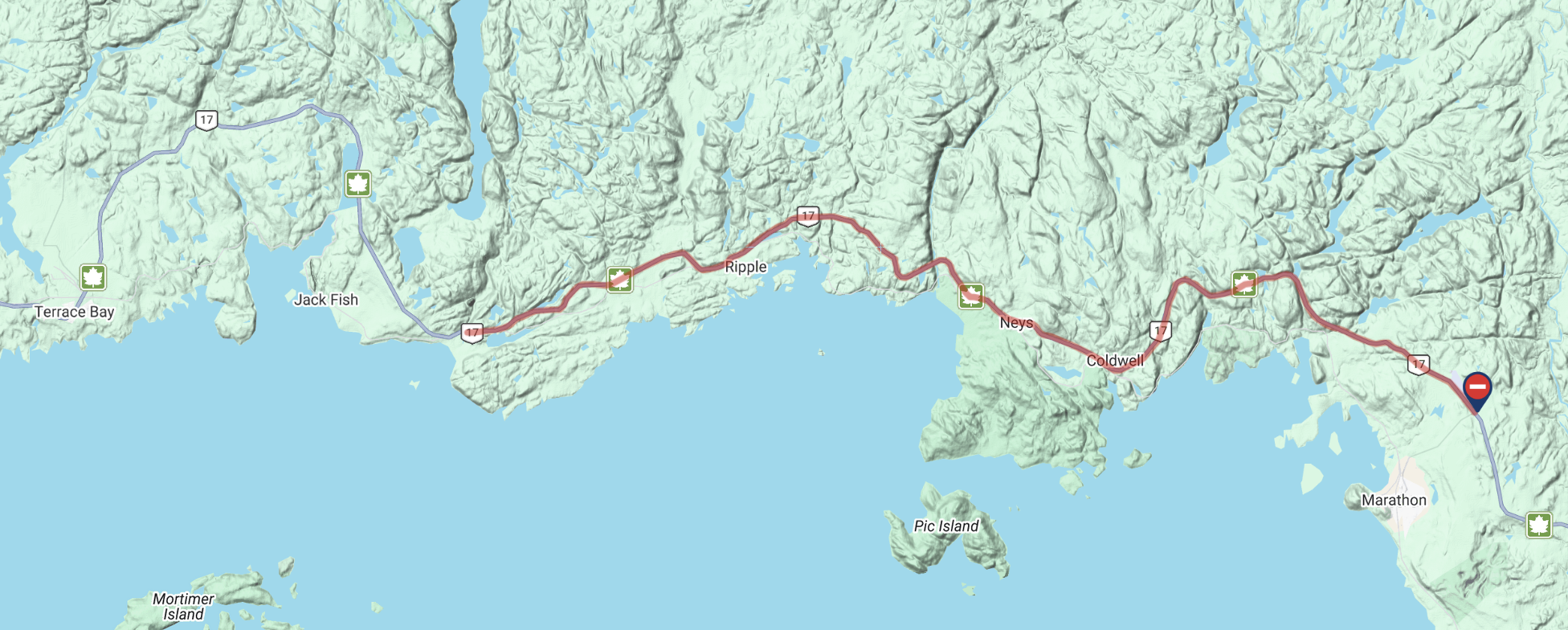 On511 is reporting that a collision on Hwy 17 has closed the highway between “PENINSULA RD (FORMER HWY 626 TO MARATHON) (S), Marathon and STEEL RIVER BR – E ABUTMENT, Terrace Bay.” Further information is “Hwy 17 Closed due to jackknifed TTU.”