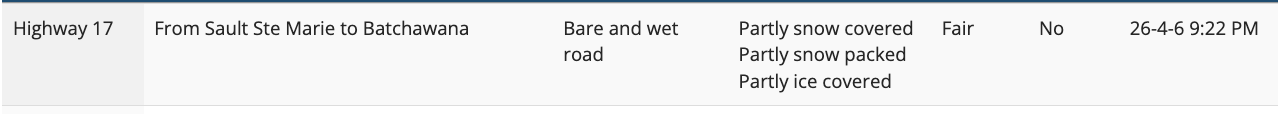 Earlier this evening there was a collision at Havilland due to icy road conditions. Social media reports are of extremely icy road conditions south of Montreal River, and transports stuck on the highway (somewhere south of Wawa).