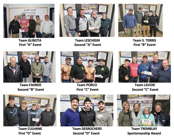 The Wawa Men’s Annual Bonspiel was held April 10 – 12, with 18 teams participating. Thanks to Club President Jim Hoffmann and Secretary-Treasurer Andy Stevens who organized the event.  Thanks to all the participants, Pat Harron and her crew for a great meal, the ladies who BBQ’d the steaks, the volunteers at the Registration Desk and at the Random Prize table, the refreshment and the MHS students who served the chicken wings and chili and were the weekend ice sweepers, members of Wawa Men’s Curling, and the staff at the Community Centre.