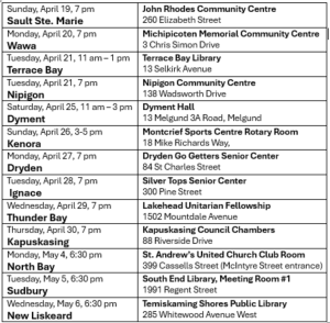 Workshops later in the month will be held in Dyment, Kenora, Dryden, Ignace, Thunder Bay, Kapuskasing, New Liskeard, North Bay and Sudbury.