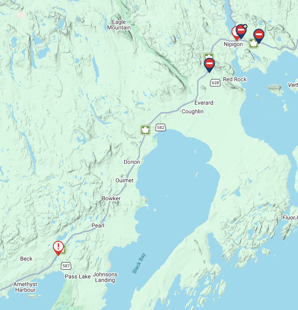 - Collision on HWY 17 Both Directions at SEC HWY 628 (E) – TO RED ROCK, Nipigon. All lanes closed. 9:21 p.m.
