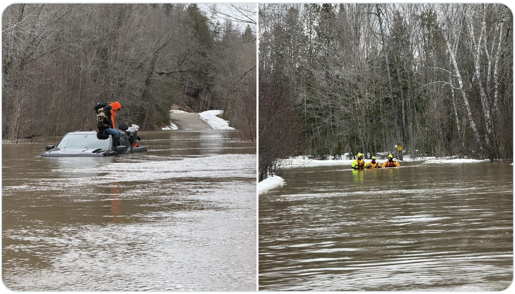 Individuals called 911 to report being trapped on the roof of their vehicle after driving into a washout. The vehicle quickly became submerged, and water levels were rising. Sault OPP was assisted by Goulais Fire & Rescue, who utilized their rescue boat. Sault Search and Rescue also attended with their water rescue equipment. Thank you to our local first response partners!