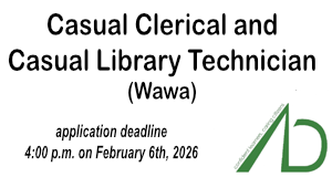 Casual Clerical and Casual Library Technician – Wawa The Algoma District School Board invites applications from qualified applicants for the position of Casual Clerical and Casual Library Technician in Wawa. Post Secondary Education is preferred from either an Office Administration program or Library Technician program. The hourly rate of pay varies, based upon the assigned position, but ranges ...